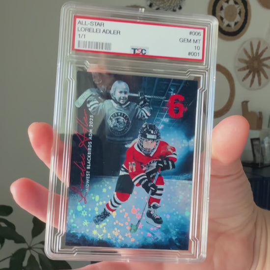 Each personalized trading card is printed on premium stock, sealed in a protective collector case, and designed to highlight the athlete’s name, number, and team colors. It’s the ultimate keepsake for families, coaches, and sports fans who want to turn memories into lasting collectibles.